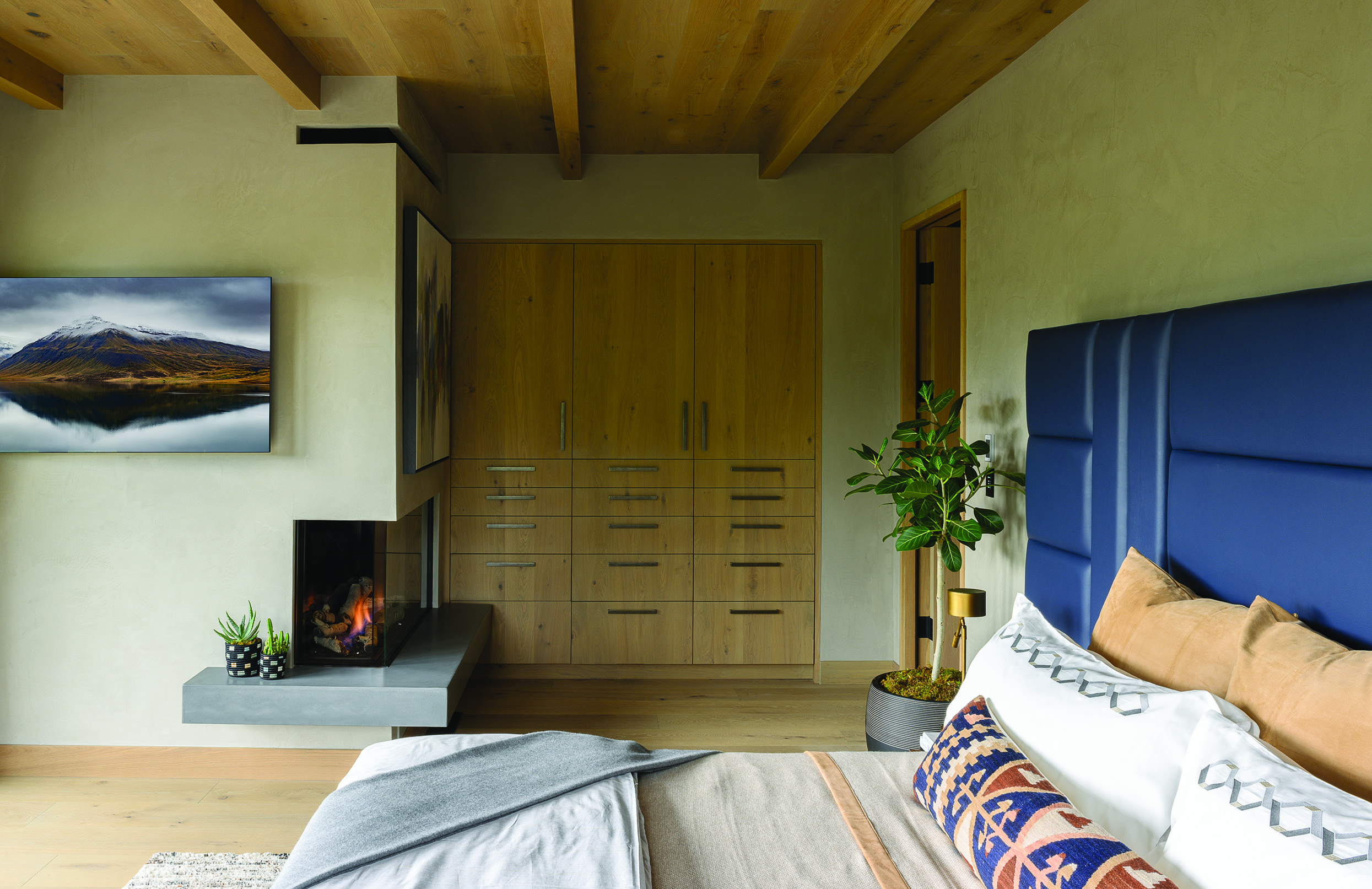 One of the primary bedrooms integrates tailored touches such as a custom leather headboard with crisp lines, linen bedding with a geometric design and a sleek corner fireplace above a floating concrete shelf. | Photo: Alex Fenlon