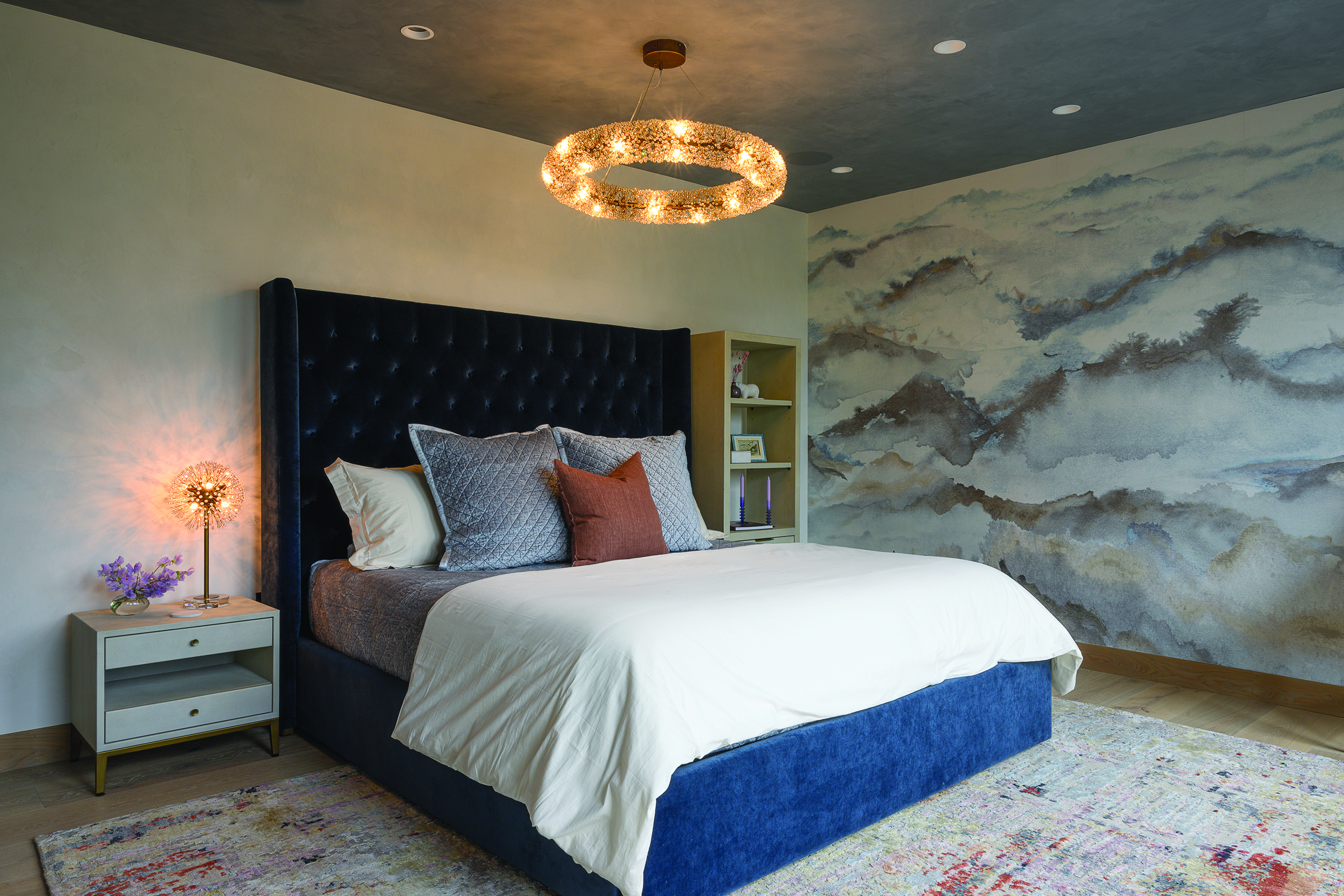 Of course, daughter Lilli got a say in the design too. She picked soft colors and finishes.“Lilli’s bedroom is really thoughtful,” Hermanson notes. One wall features atmospheric wallpaper that looks like clouds and mountains. There is also a custom skyscape painted overhead. “It was really important for her to look up from her bed and not see a white ceiling—she has a good eye,” Lydick says.