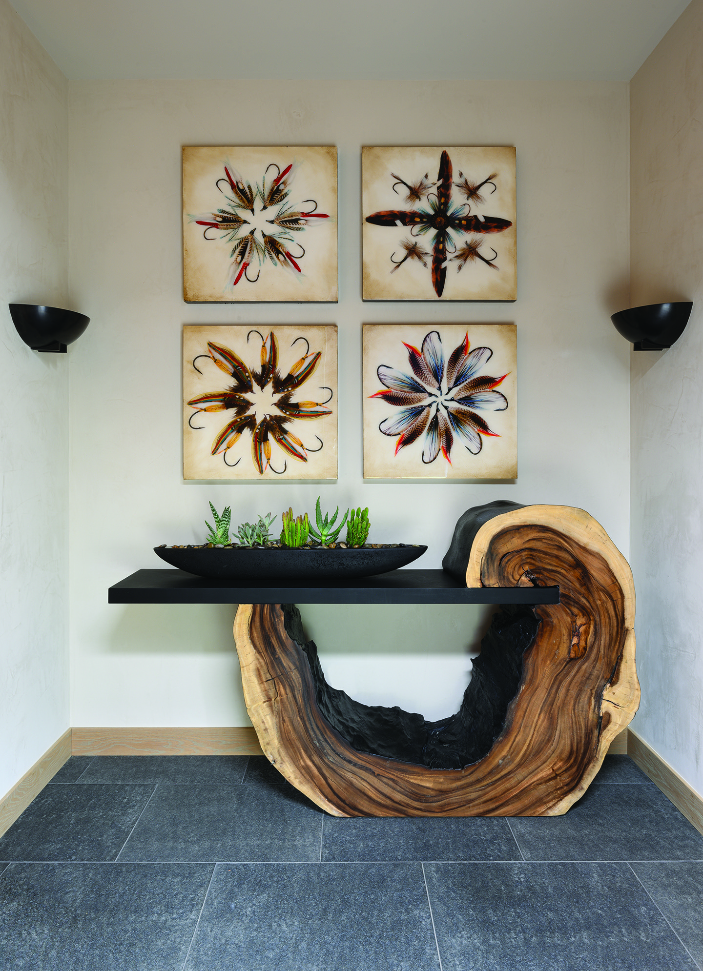 The side entrance of the home features a dramatic wood-and-iron cantilevered console table from HW Home and custom art. | Photo: Alex Fenlon
