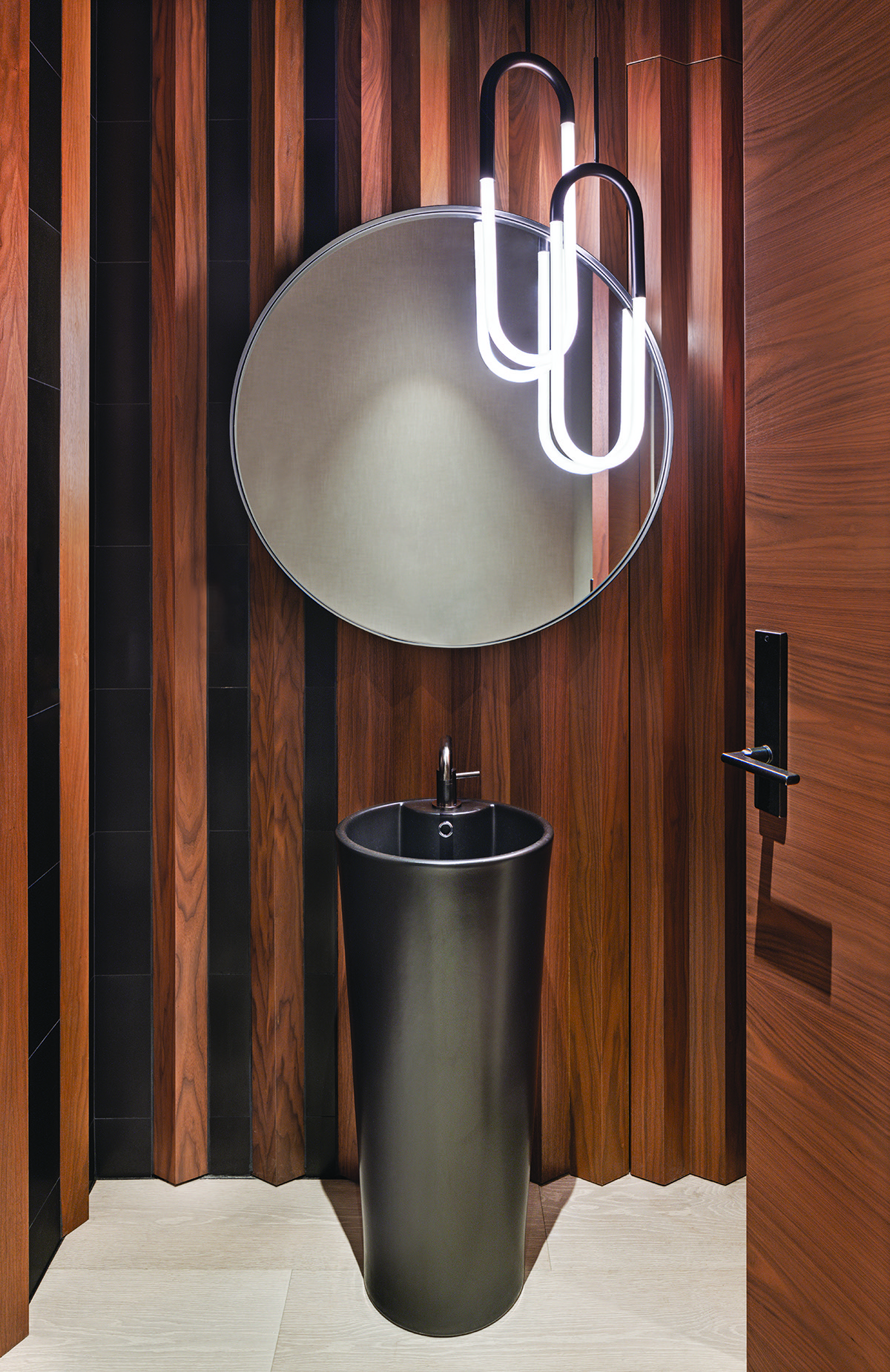 Downstairs, Lang kept the same sense of sophistication but with a casual feel. A mohair-covered Verellen sectional appoints the family room, where the designer used leather wall tiles in black and taupe hues to echo the vertical forms of the walnut paneling upstairs. “It adds interest and strength to the whole composition,” says Lang, whose intentional use of materials and curated furnishings was perfectly suited to the project’s locale and its owners. “It’s very comfortable and livable, but at the same time the design has some boldness,” she says. “It’s a little more daring, and the owners were willing to go on that journey.”