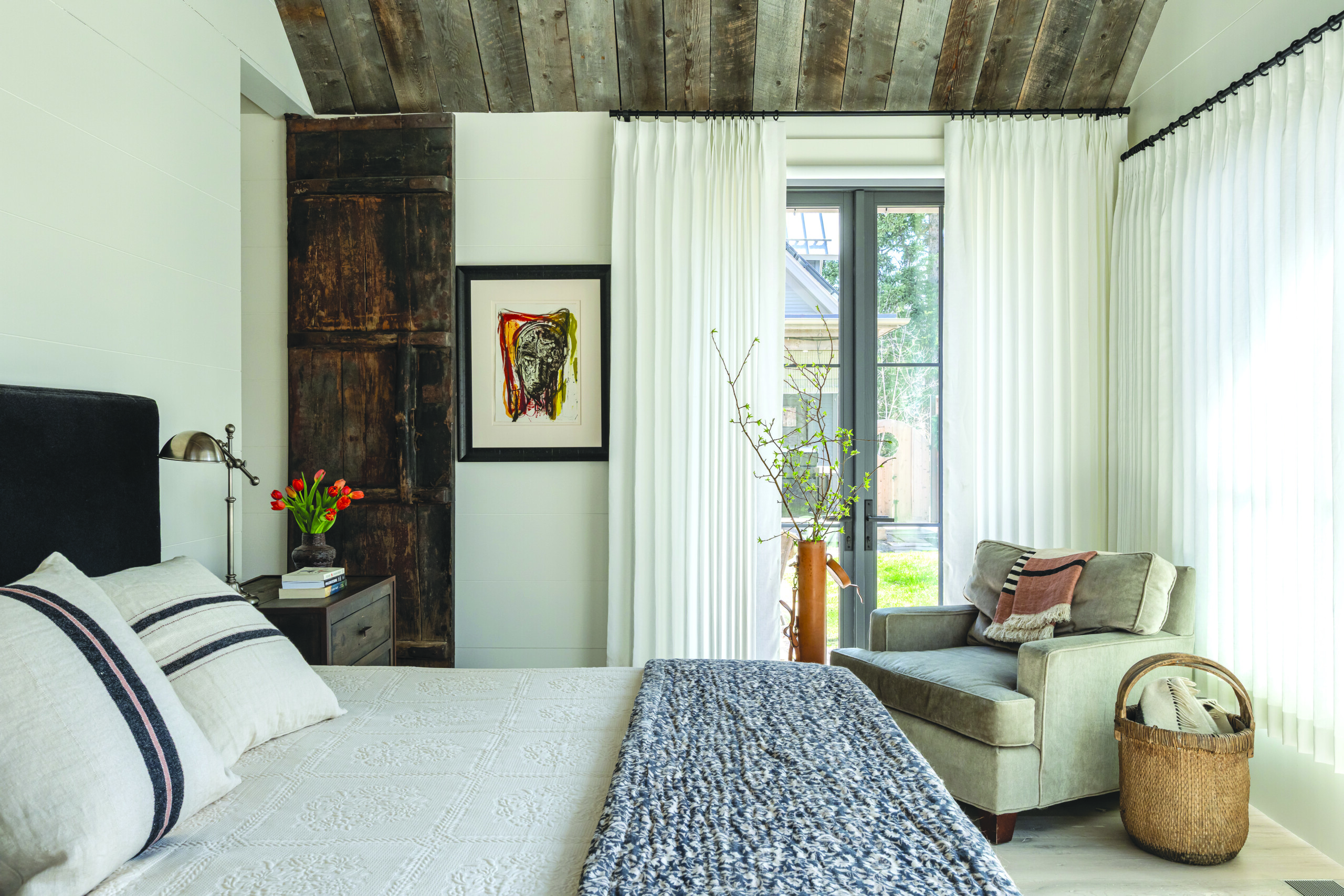 The renovation masterfully preserves the home’s street presence, down to the antique butterfly casement windows, painstakingly restored, under ornamental brick arches. Additions on either end (primary suite to the west; mudroom to the east) recede toward the rear of the property, their dark exteriors making them almost disappear.